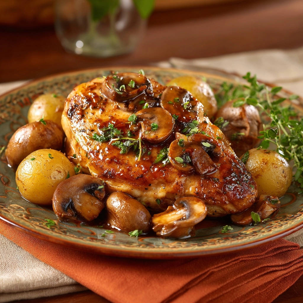 - Serve: Garnish with fresh chopped parsley and thyme sprigs. Serve immediately, ensuring each plate gets plenty of that incredible, juicy chicken with the rich mushroom sauce and tender potatoes.