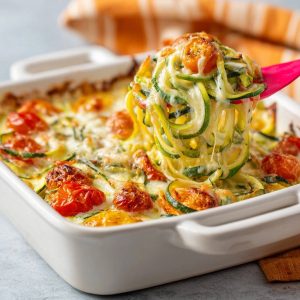 Serve: Let the casserole rest for 5 minutes before serving to allow the cheese to set slightly. Enjoy your perfectly creamy and never soggy zucchini noodle bake!