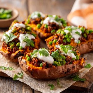 Spoon the mashed sweet potato and filling mixture back into the potato skins, creating a generous mound. Top each stuffed sweet potato with additional meat and pea filling.